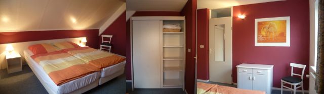 Das geräumige Elternschlafzimmer bietet Platz für ein zusätz-liches Kleinkinder-Reisebett, das bei Bedarf aufgestellt werden kann. Der große Kleiderschrank und eine Kommode sorgen für genügend Stauraum - auch bei längerem Aufenthalt.