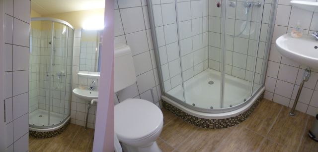 Im Dezember 2011 haben wir uns gerne von der alten Dusche und den "hübschen" grauen Bodenfliesen verabschiedet. Die neue Runddusche mit Mosaikverblendung, die großrah- migen Holzdesign-Fliesen und der sandfarbene Deckenanstrich verleien dem Bad nun eine zeitgemäße Optik.